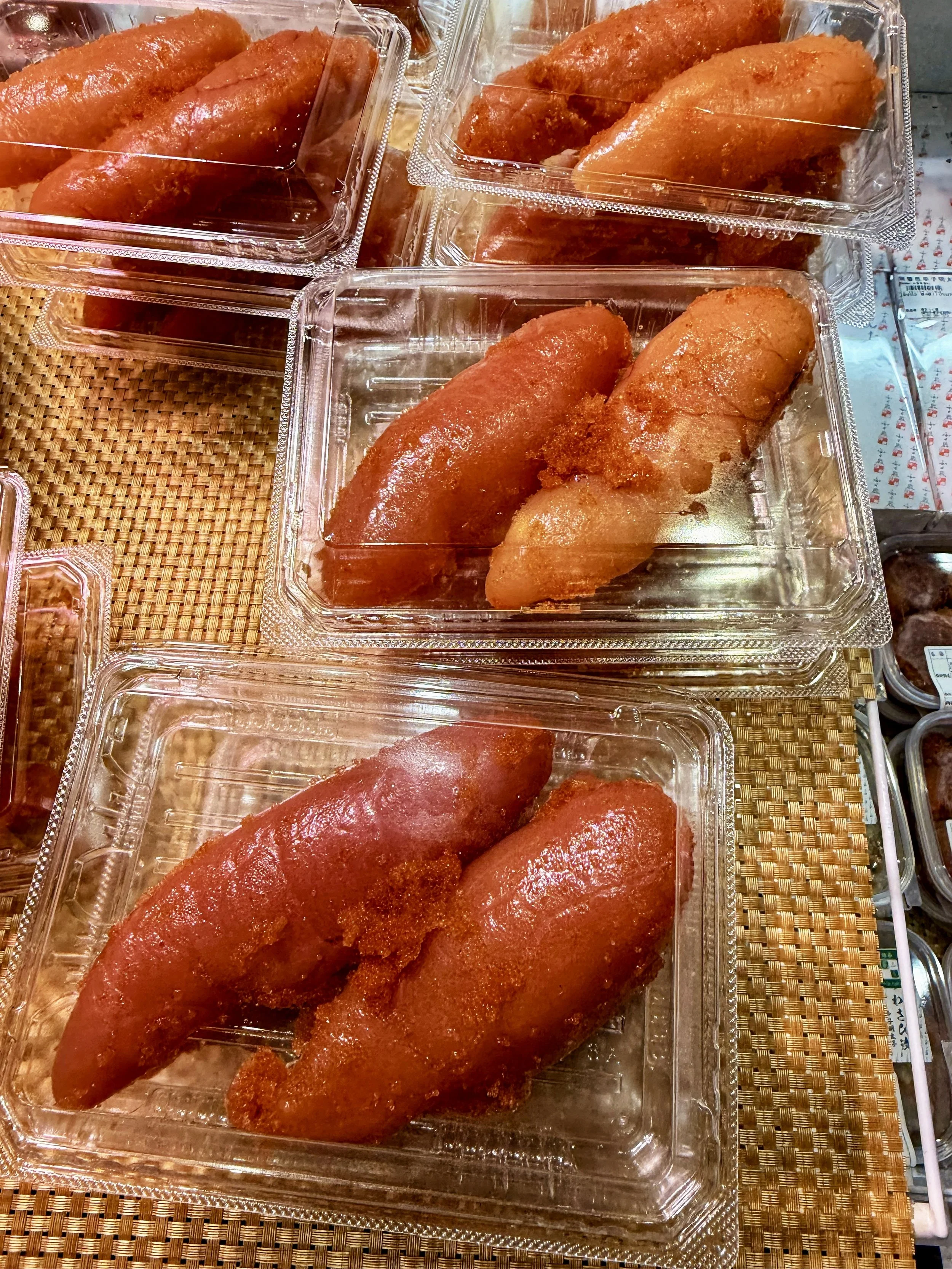 Mentaiko: Throughout Fukuoka, we noticed these bright pinkish “sausage” looking sacs of fish eggs advertised as part of almost every dish - over rice, noodles, spaghetti, sushi, everything (hungry yet?!). Turns out, mentaiko (chili spice marinated Alaskan pollock roe) is a Fukuoka specialty with a Busan, South Korea influence. There’s even mentaiko vending machines throughout the city, in case you couldn’t possibly wait to get to the store. We finally mustered up our appetite courage and ate spaghetti mentaiko carbonara - true Italian Japanese fusion dish. It tasted like slightly spicy, salty, ocean of fish!