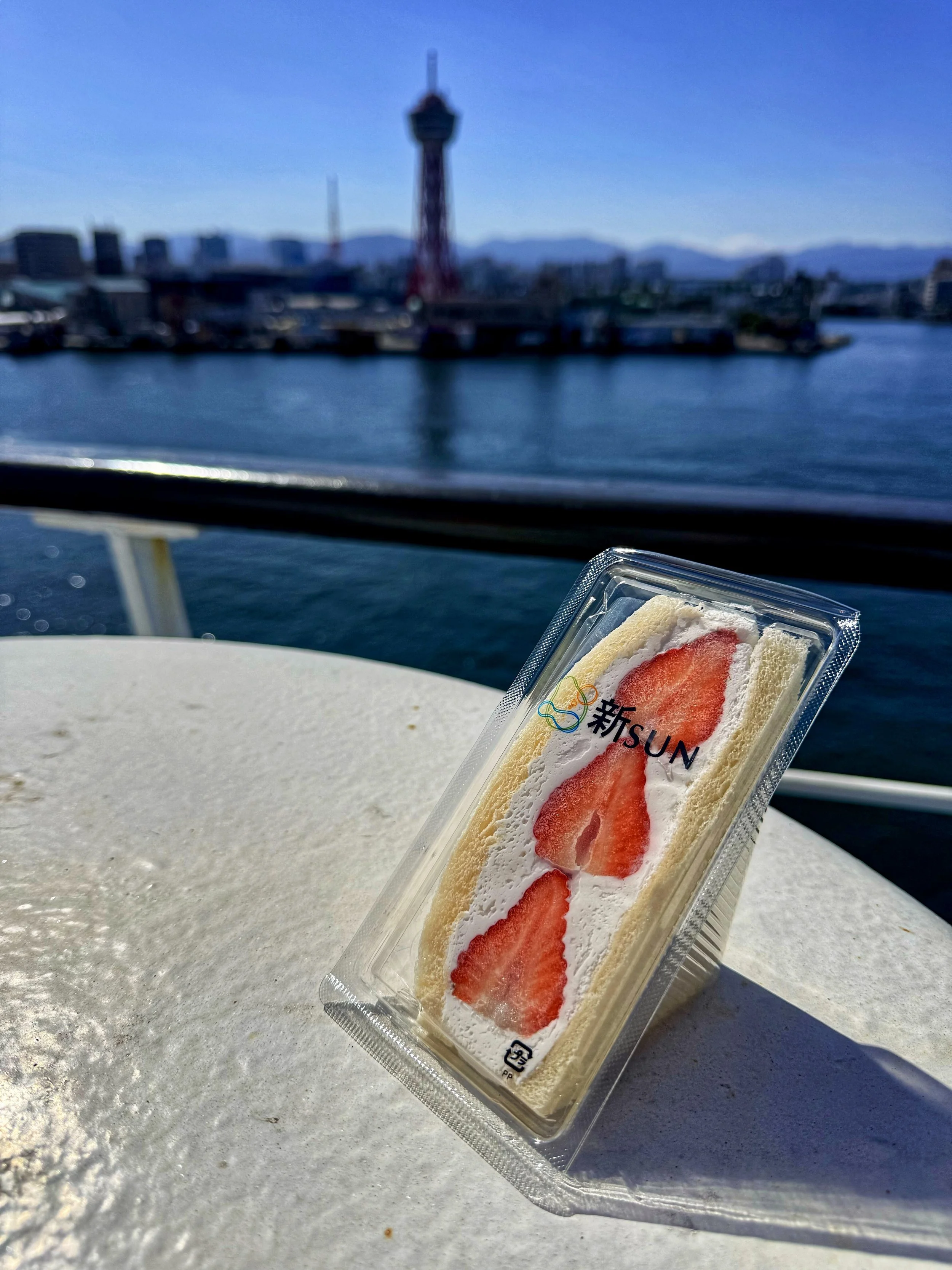 Strawberry Season: Japan goes all out with seasonal products. It gets incorporated into everything and because of its seasonality, customers queue up in long lines to avoid FOMO. We got caught up in the strawberry season trendy frenzy by lining up for strawberry sandwiches at a famous shop, Fruits Garden Shin Sun. We enjoyed the sando on the ferry deck, waving goodbye to Fukuoka.